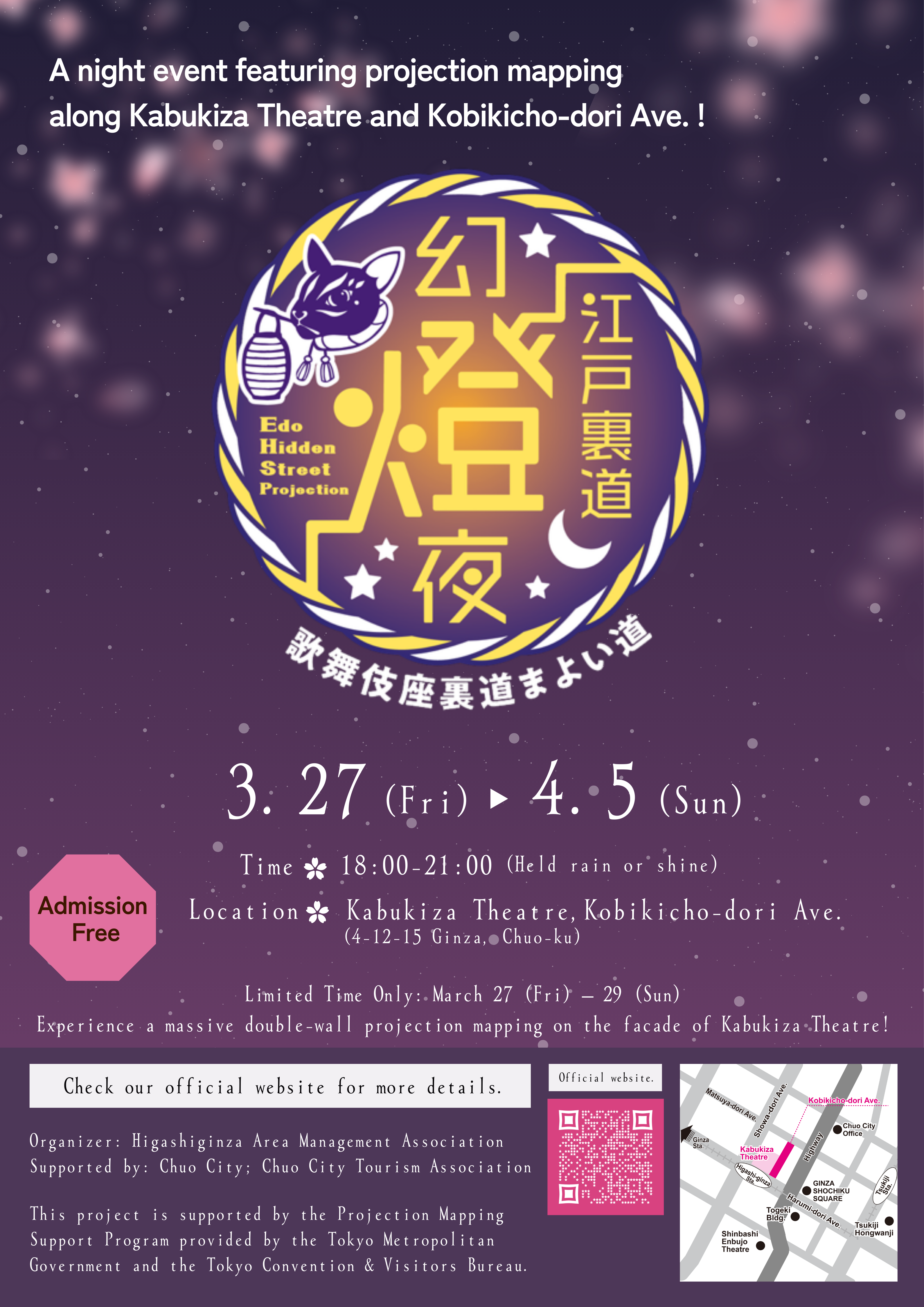 Higashiginza Area Management Association is pleased to announce the “Edo Hidden Street Projection: Wandering the Hidden Street of Kabukiza,” a 10-night event featuring projection mapping on the exterior walls of the Kabukiza Theatre. The event will take place from Friday, March 27 to Sunday, April 5, 2026, along Kobikicho-dori Ave.