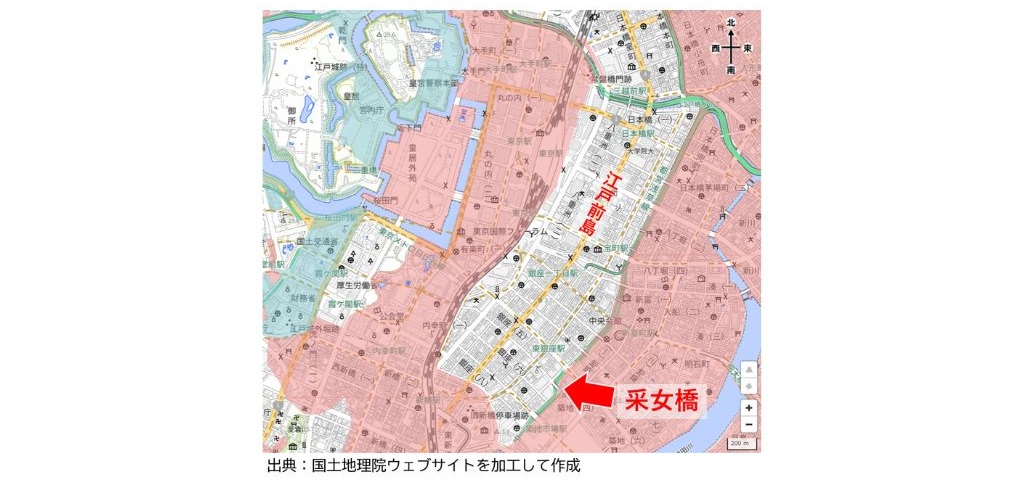 江戸時代の地図を見ても築地川が采女橋付近でS字にクランクしていることがわかります。築地を埋め立てて造成した際に、江戸前島の東岸の海岸線を残してできた川が築地川なのです。実際に歩いて「なぜ?」と考え、解き明かしていくのが地理の醍醐味です。
