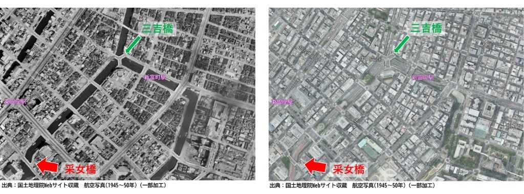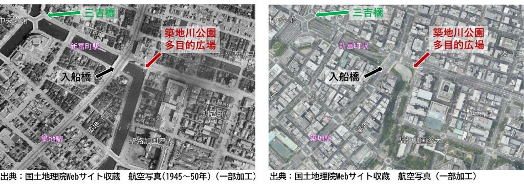 航空写真にうつる三又の橋が三吉橋です。左の1945年~50年頃の航空写真では築地川に架かる姿が確認できます。現在は首都高の上に架かっています。