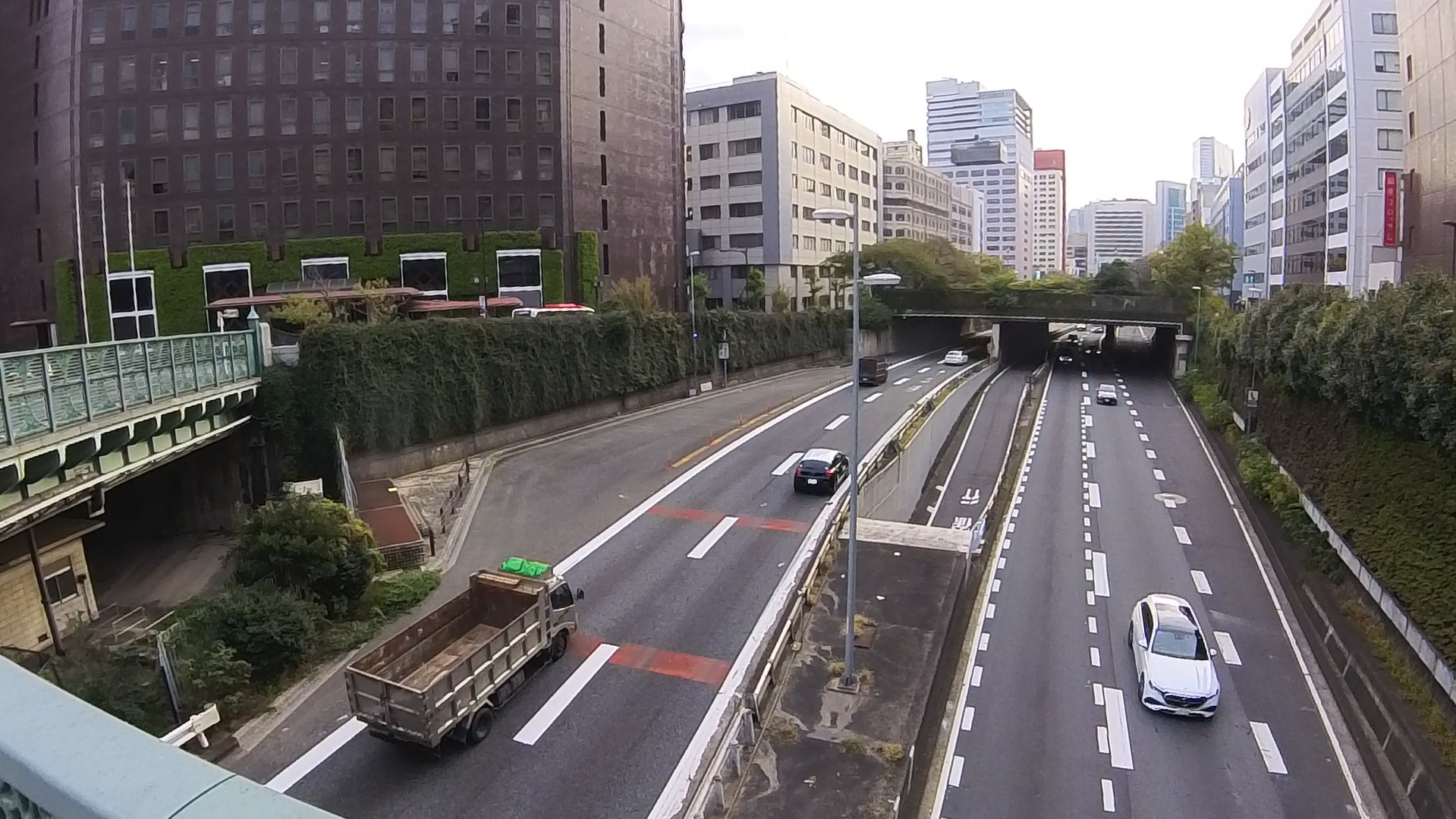 写真の道路の左側をみると少し膨らみがあることが確認できます。ここにはかつて小さなパーキングエリアがありました。首都高速都心環状線で唯一のパーキングエリアだったそうです。ただ、トイレしかありませんでしたが。